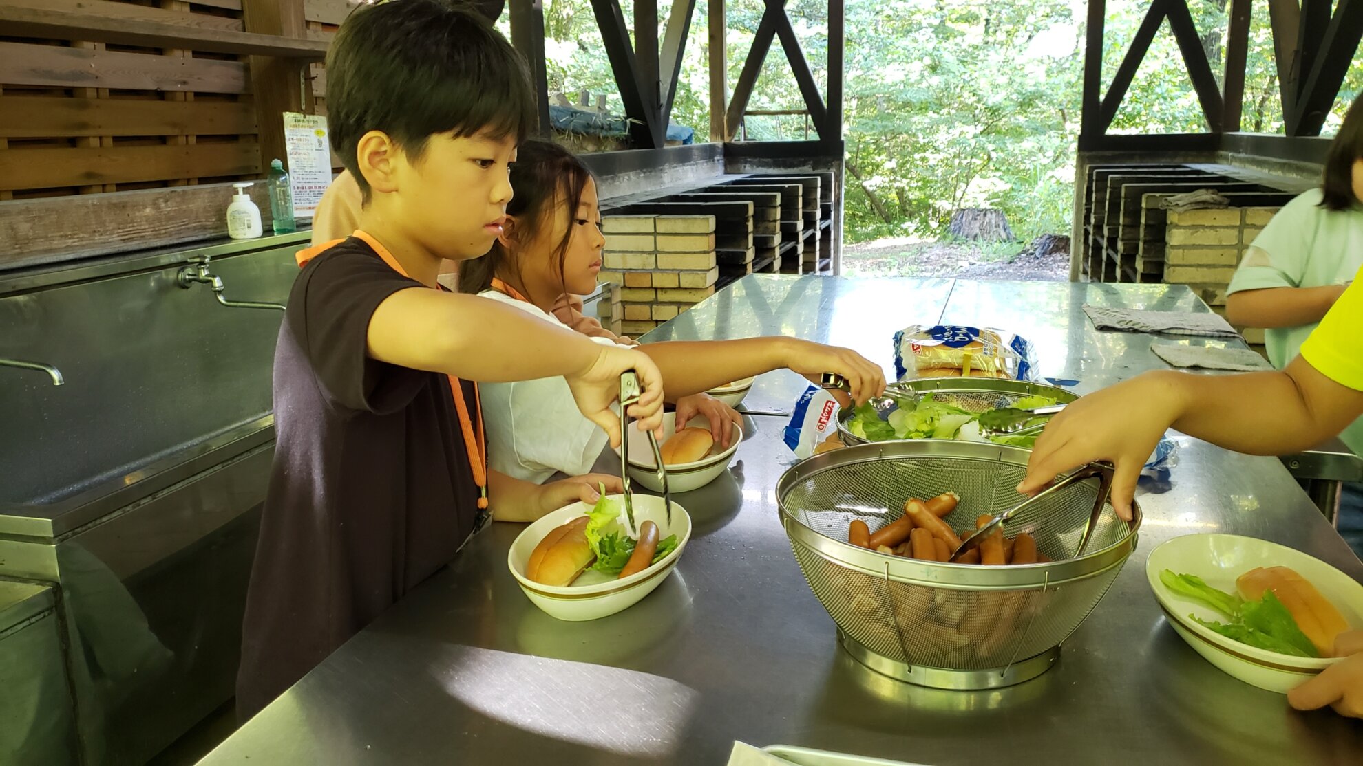 ドッグパンにレタスに、ウィンナー、チーズなどを取り分けて