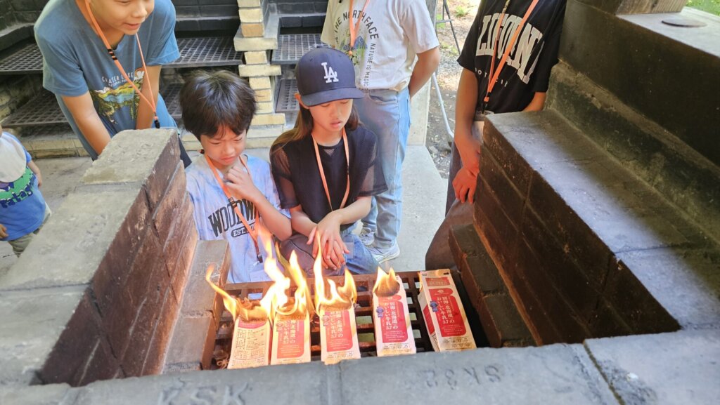 牛乳パックに入れて、火をつけます。