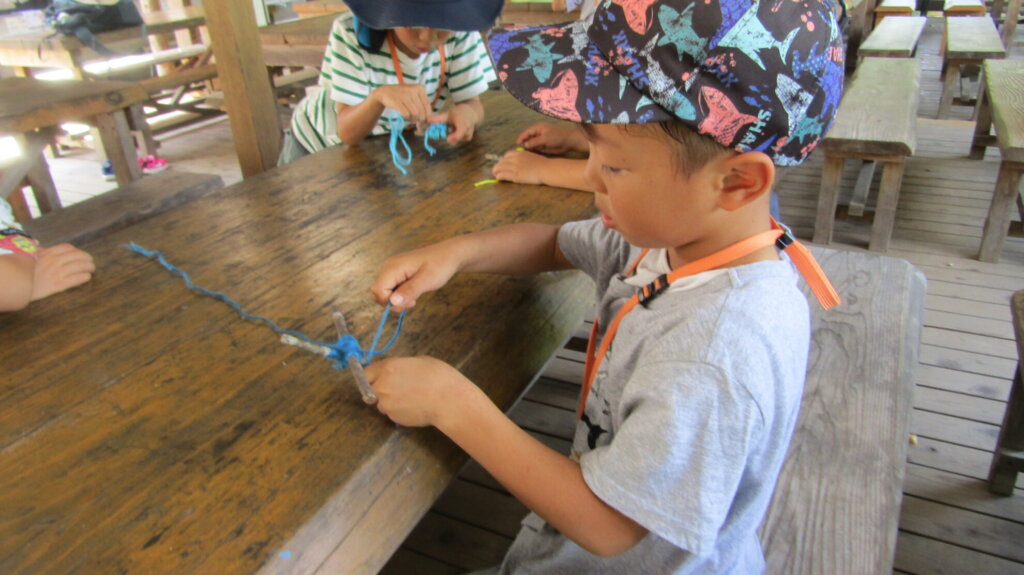 好きな色の毛糸を選んだら、木の枝に毛糸を縛って