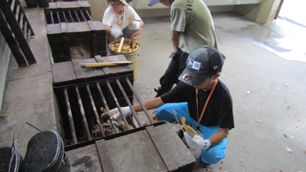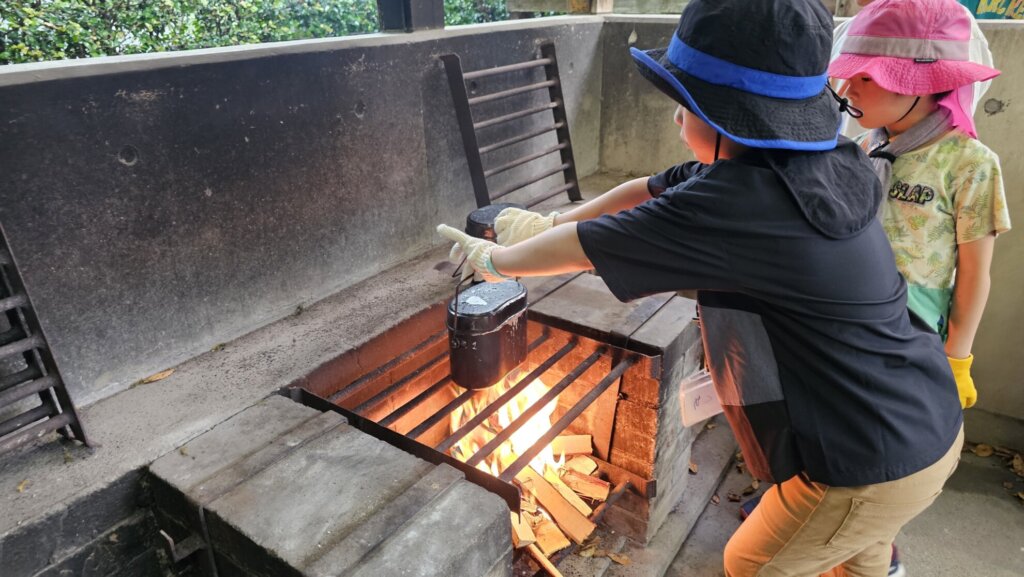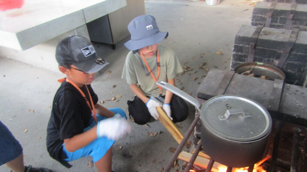 その後、火起こしの仕方や薪の組み方を教わったら、自分たちで実際に組んでみます♪