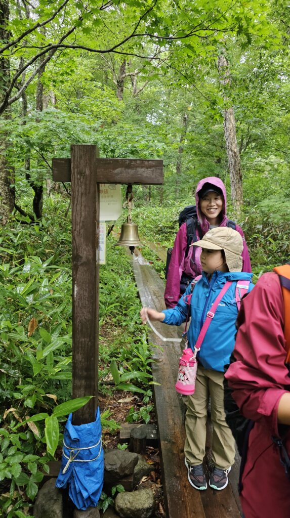 雨の森を抜けると熊の多く出るエリアには接触を避けるための「鐘」が設置され、人間が来たことを知らせます♪