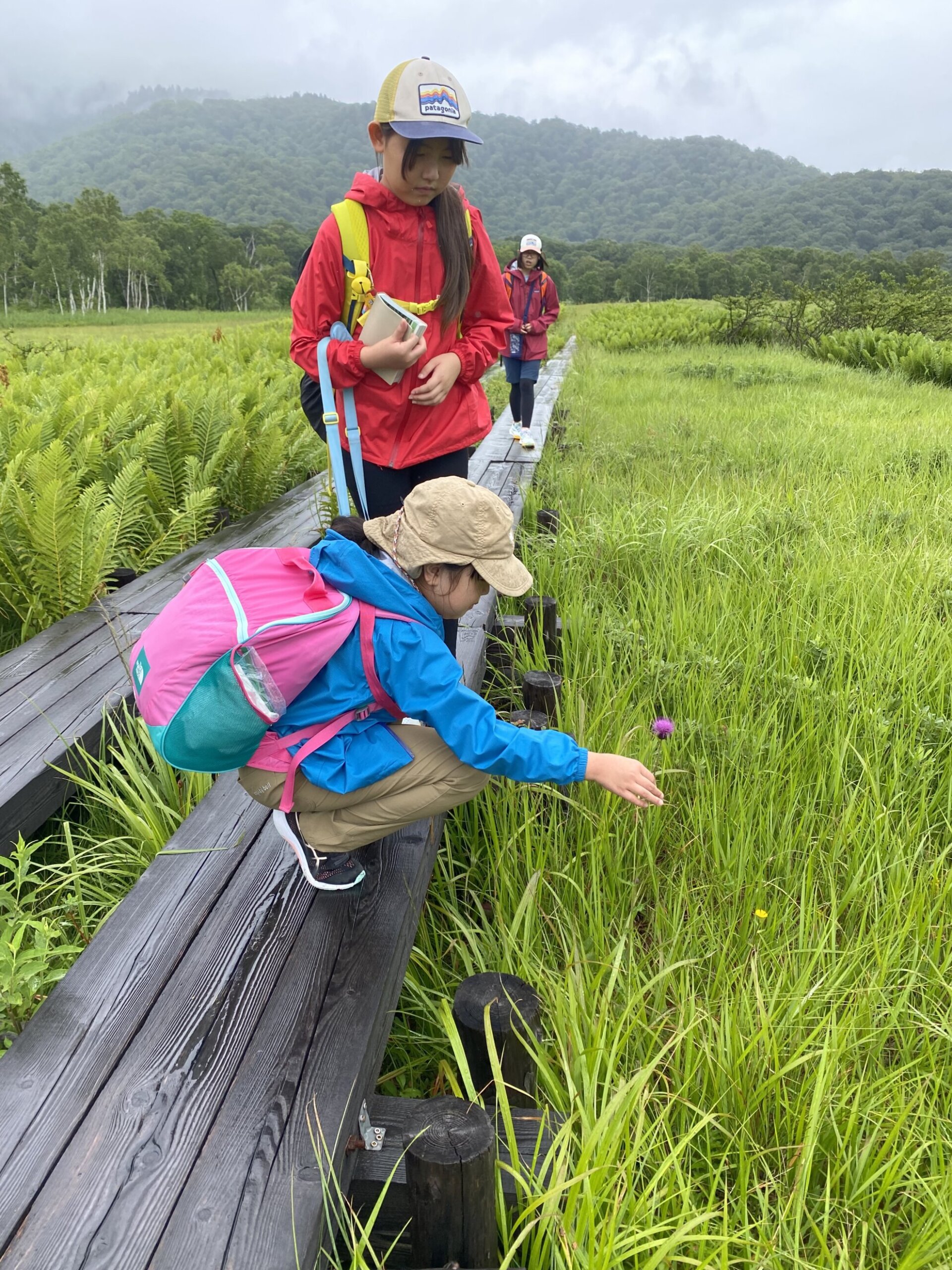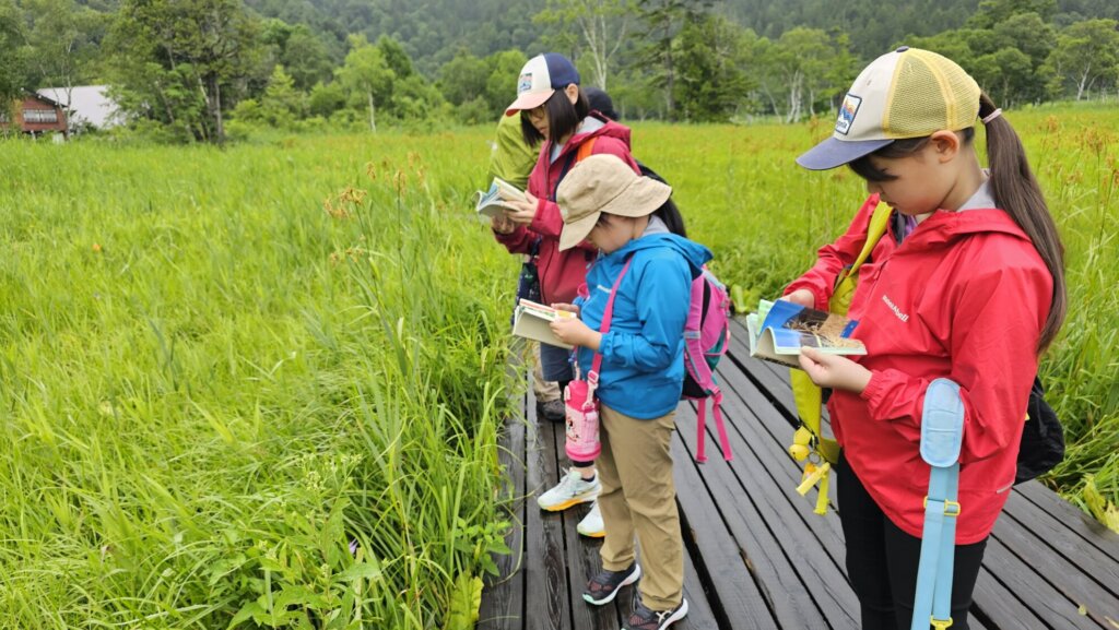 立ち止まって、解らない高山植物は図鑑で調べたり、実際に観て、触って、香いをかいだりして特徴を観察します♪