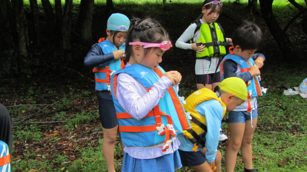 次にライフジャケットの正しい着用方法を教わって