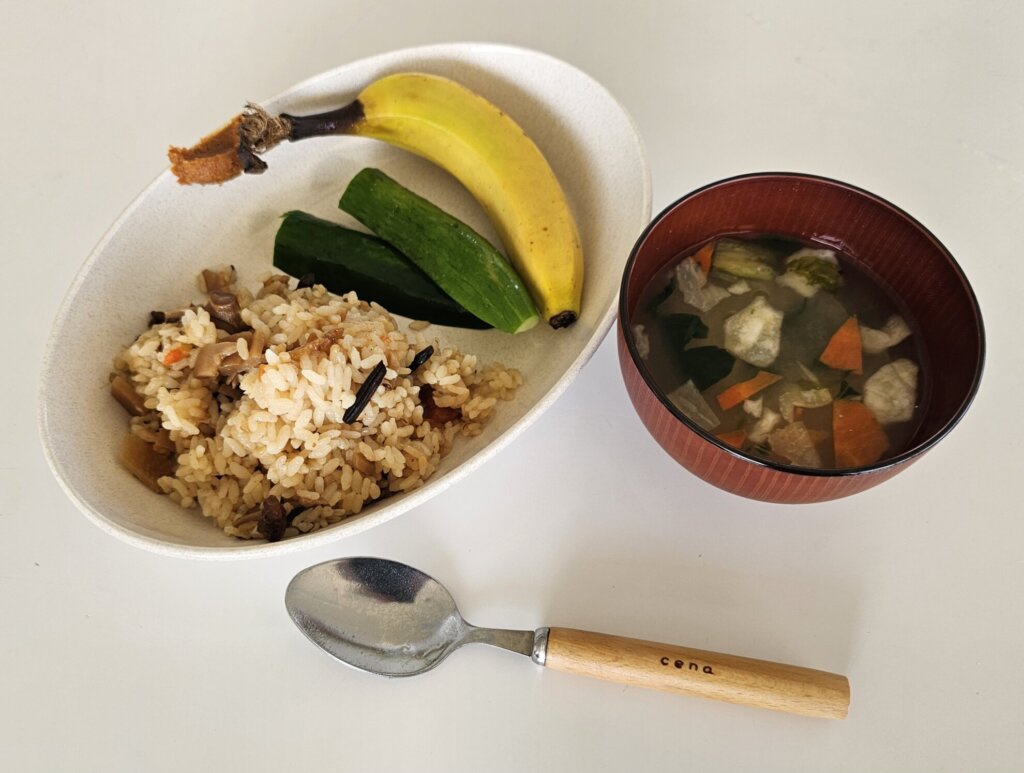 メニューは炊き込みご飯、夏野菜たっぷり味噌汁、キュウリ、バナナ