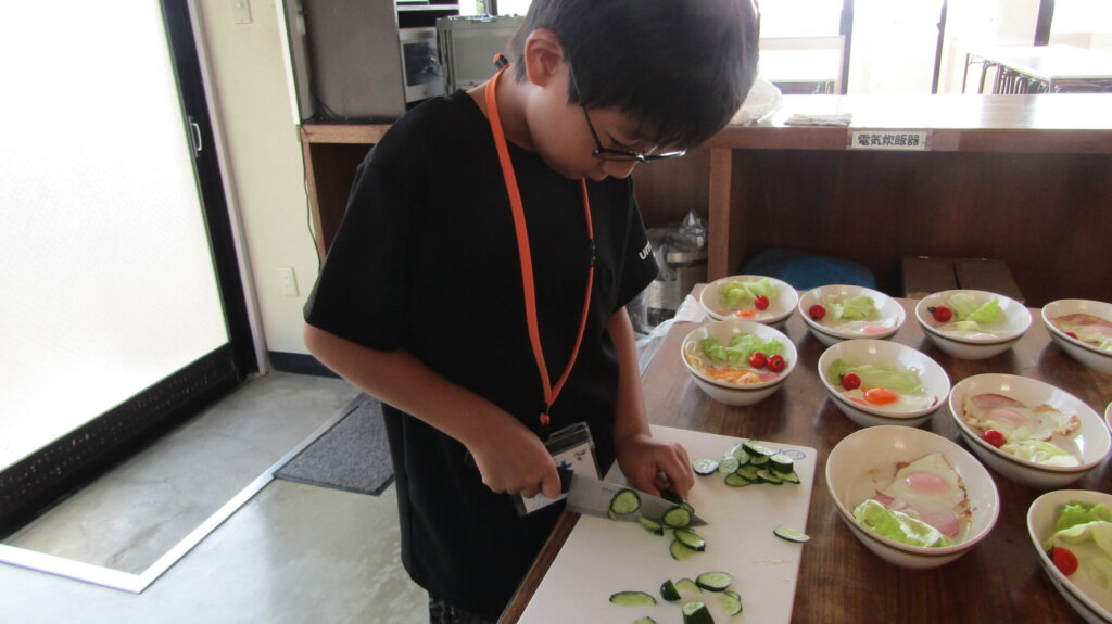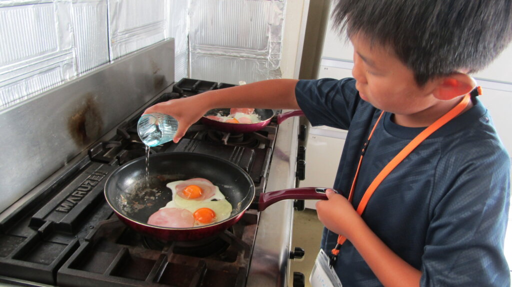 ここからは当番制で食事の準備をしていきます♪ ハムと目玉焼きを焼いたり