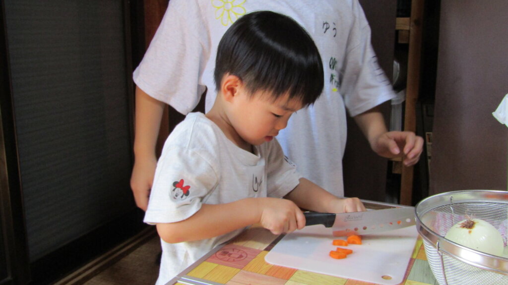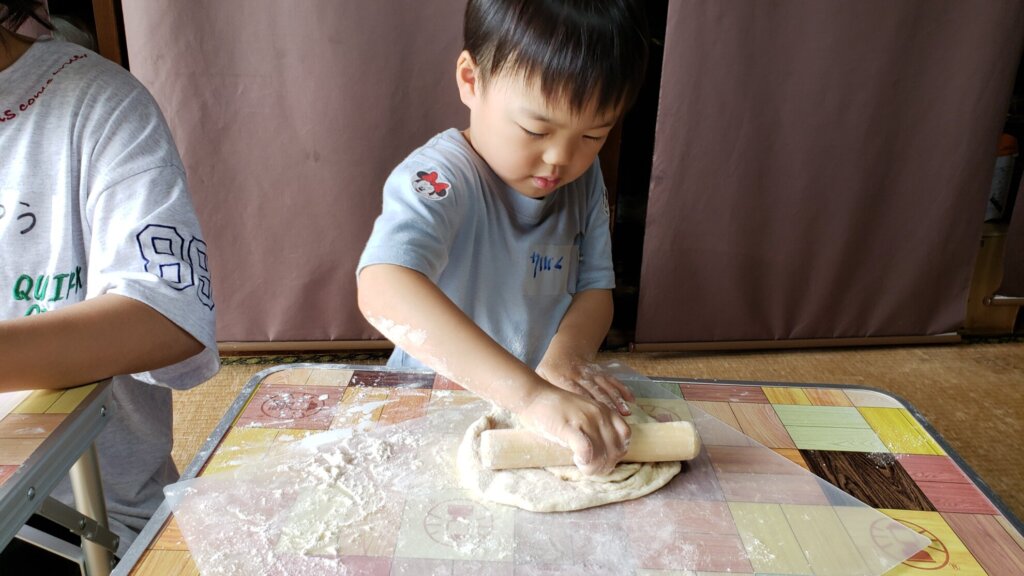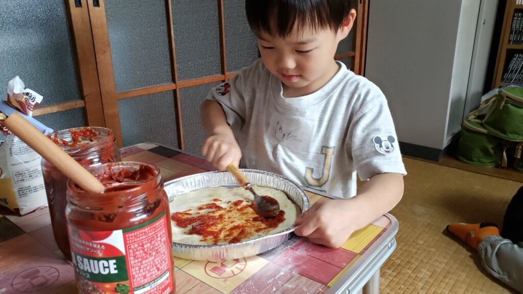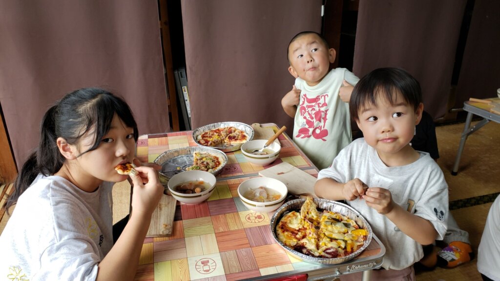 自分で作ったPIZZAと一緒に野菜を切って作ったコンソメスープも一緒に「いただきま~す!」