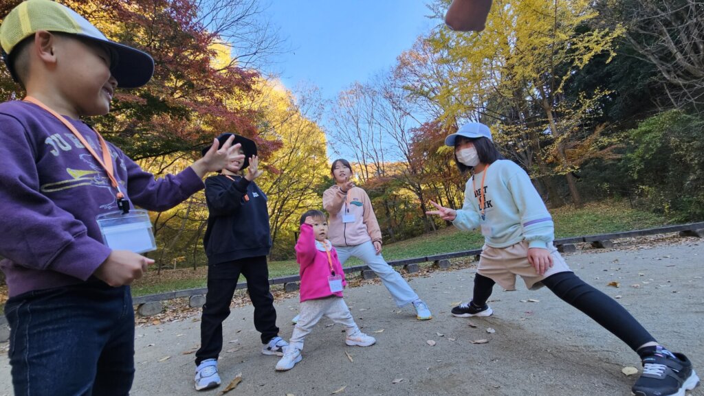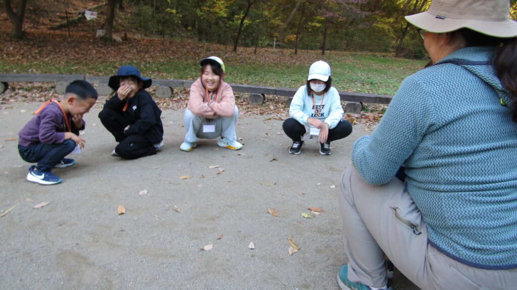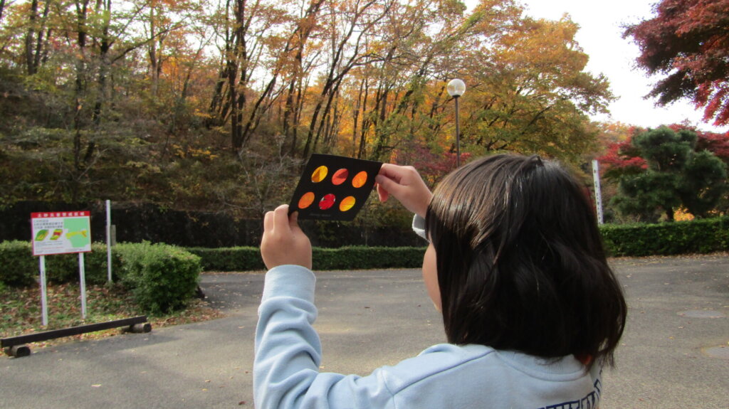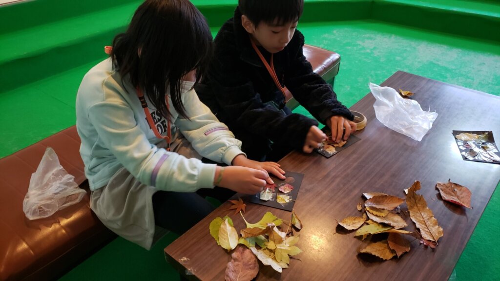 次に「赤・緑・黄」などの色とりどりの落ち葉をからお気に入りの形や色を選んで拾って