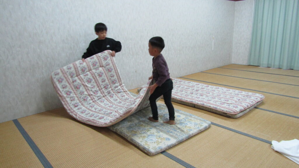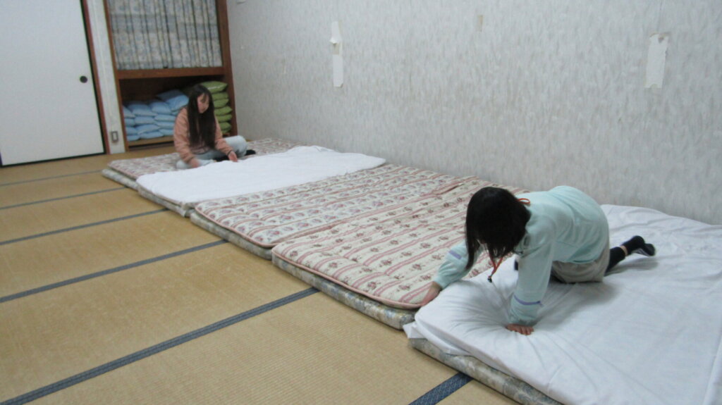 オリエンテーションで教えてもらったように、シーツを使って、自分が使う布団を敷きました。