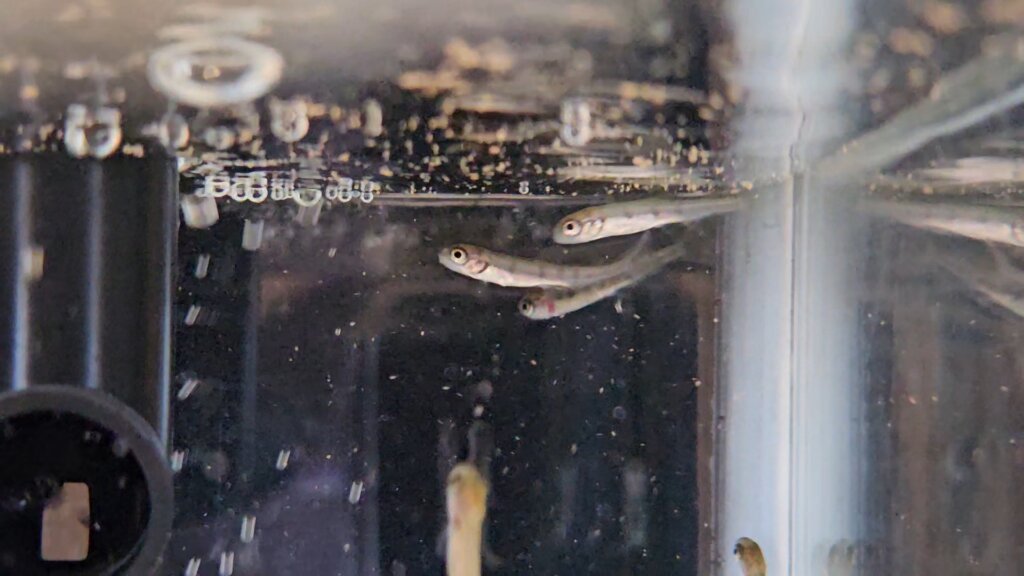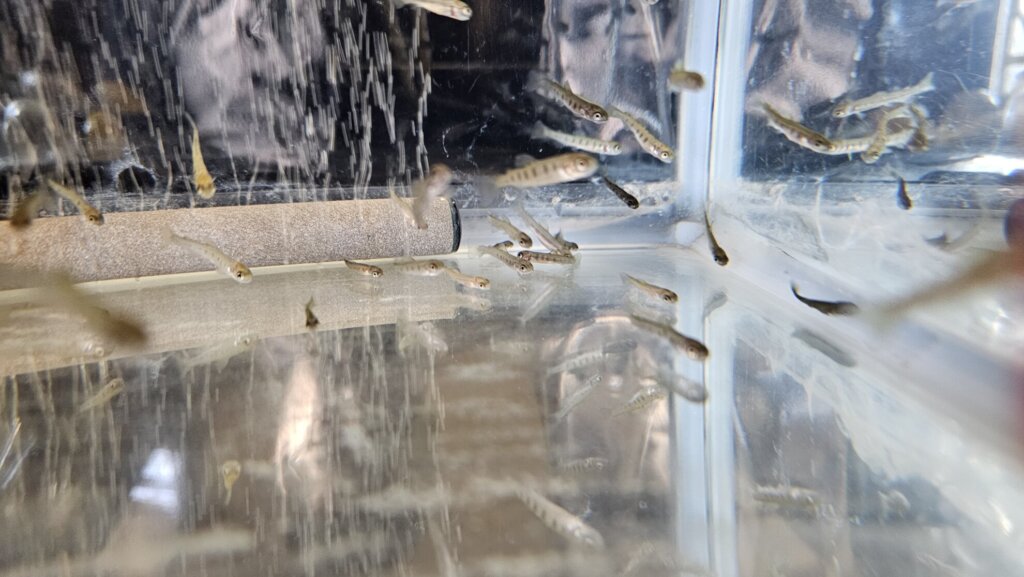 飼育期間も折り返し。稚魚は段々とヤマメの特徴となる模様(パーマーク)が目立ち