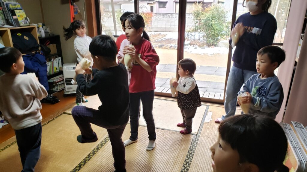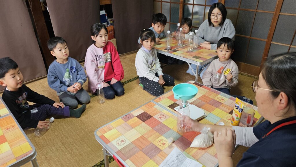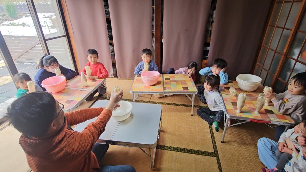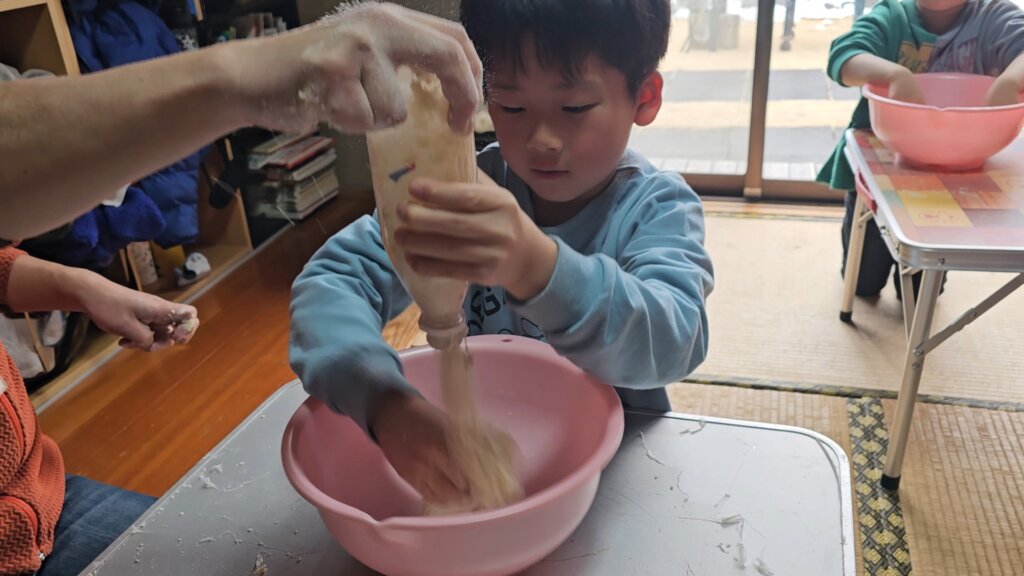 まずはリーダーが生地の取り出し方を説明しながらお手本♪ そのあとは、一人ひとり、自分でチャレンジ!