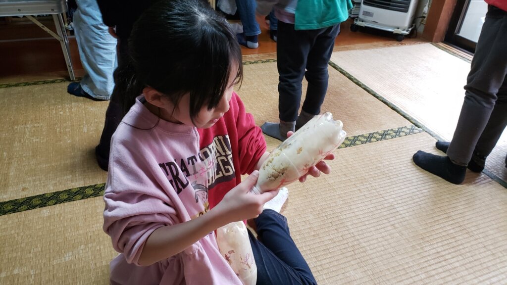 だんだんと、ペットボトルの中で生地がまとまったら、生地を寝かせていきます!