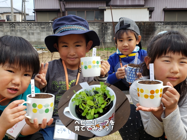 - 主な活動:畑の作業(耕す、種・苗を植える、雑草とり、収穫)、マイカップファームづくり、ハンバーガーづくり、ジャガイモ掘り、流しソーメン、野菜スタンプでエコバック作り、ピザづくり、ハロウィン(収穫祭)、サツマイモ掘り、冬野菜で作るすいとん作り、野菜の成長・観察記録 他